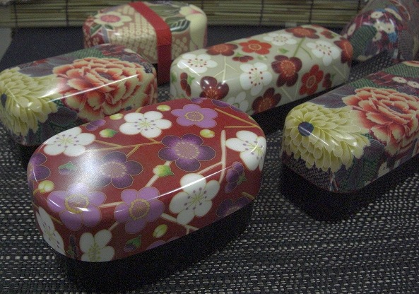 友禅染の布地を貼り、樹脂でコーテンングしたお弁当箱です。容器は電子レンジにも使えます。